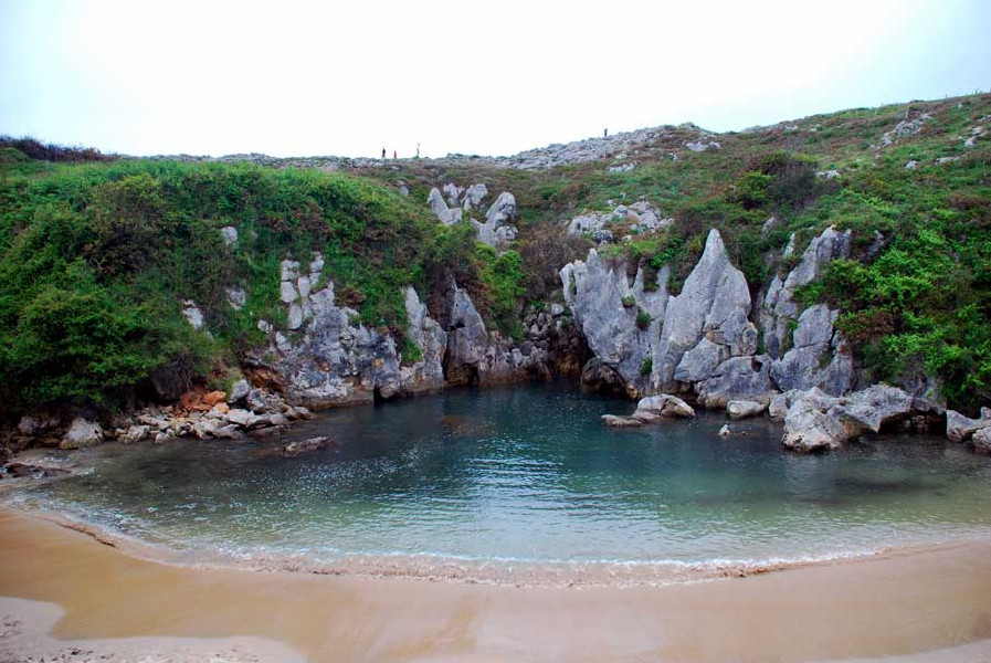 Otóż Playa de Gulpiyuri jest wypełnionym wodą lejem krasowym. Ma on około 40 metrów długości, a woda jest doprowadzana do niego dziesiątkami naturalnie powstałych tunelów, które połączyły lej z pobliskim morzem, dlatego też poziom wody w leju zależny jest od przypływów i odpływów pobliskiego morza. W leju powstała nawet malutka śródlądowa plaża.