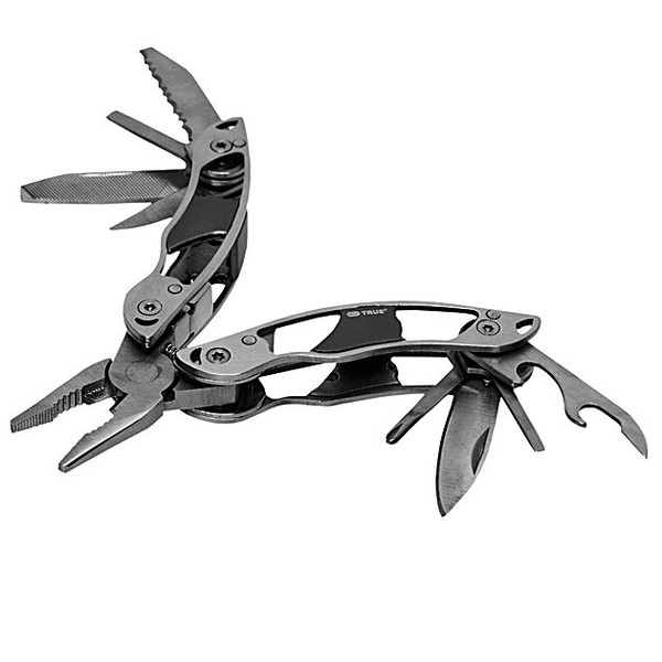 Minitool True Utility to interesujący przyrząd łączący w sobie aż 8 funkcji. Pomysłowość konstruktora pozwoliła w jednym małym gadżecie zebrać takie narzędzia jak: otwieracz do butelek, średni śrubokręt płaski, mały śrubokręt płaski, mini śrubokręt płaski, pilnik do paznokci, końcówka do czyszczenia paznokci, przecinak do żyłki, pinceta. Całość zakłada się na klucz, przypięty do np. dołączonego stalowego karabinka.