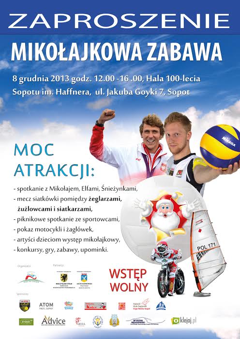 Fundacja Sport na Zdrowie, Fundacja Helios oraz Pomorski Okręgowy Związek Żeglarski zapraszają w niedzielę 8 grudnia na mikołajkowy mecz siatkówki pomiędzy drużynami żeglarzy i żużlowców oraz ich gośćmi – czołowymi siatkarzami i siatkarkami ekstraligi. Na boisku w Hali 100-lecia Sopotu będzie można zobaczyć w akcji najlepszych zawodników z Polski i zagranicy, medalistów olimpijskich, Mistrzów Świata i Europy. Ze strony żeglarzy wystąpią m.in. Przemysław Miarczyński, Piotr Myszka, Paweł Tarnowski, Piotr Kula, Paweł Kołodziński, ze strony żużlowców m.in.: Maciek Janowski, Krzysztof Buczkowski, Szymon Woźniak, Norbert Kościuch oraz bracia Pulczyńscy. Obie drużyny wspomagać będą siatkarze, a wśród nich: Kuba Jarosz, Paweł Rusek, Wojciech Serafin, Radosław Pana. Patronat Honorowy nad wydarzeniem objęli marszałek Mieczysław Struk i prezydent Sopotu Jacek Karnowski.