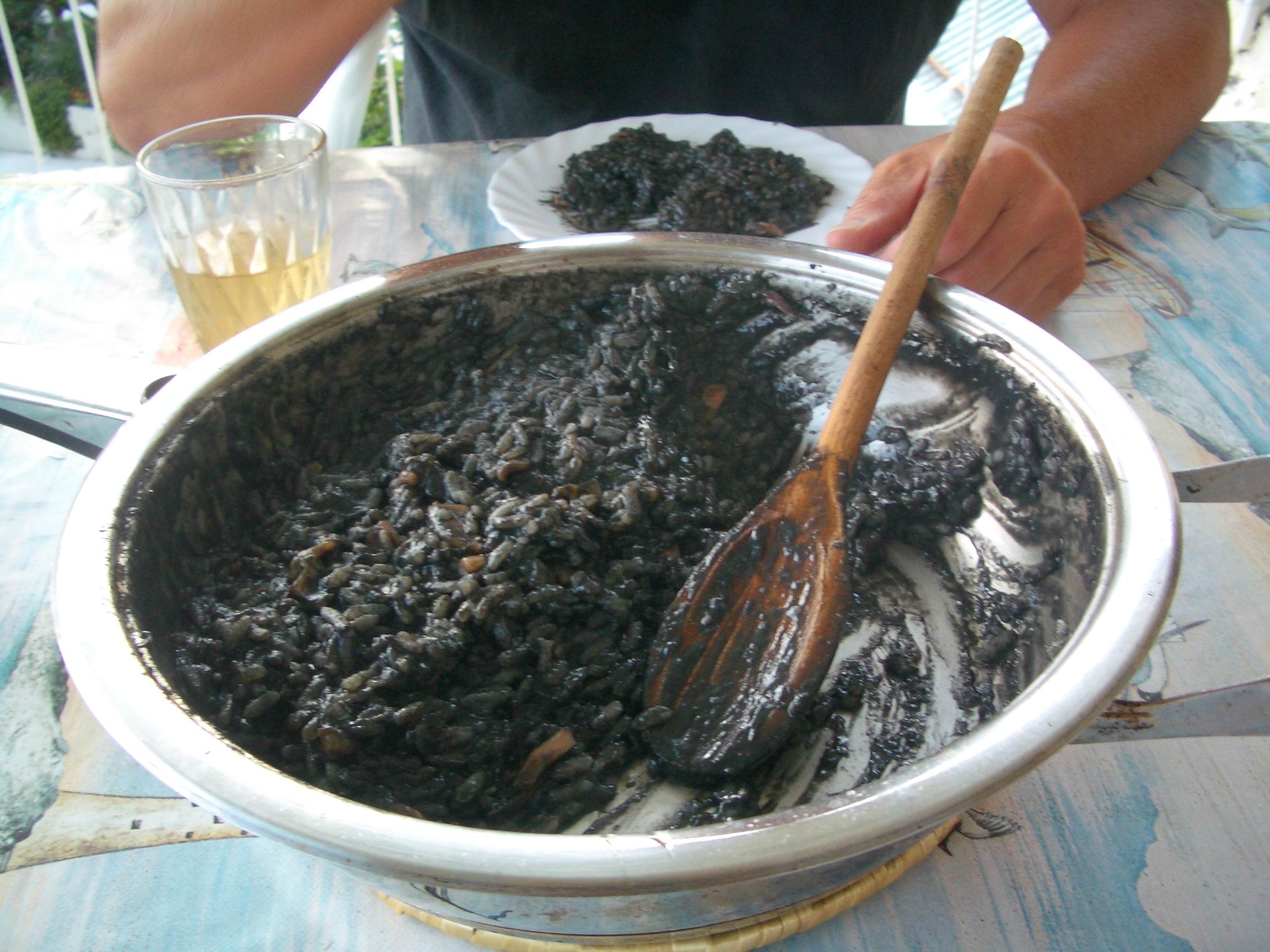 Jechałem do Dubrownika, na około jeszcze się dymiło. Serbowie już odeszli, ale wszędzie widać było ślady ostrzału ich artylerii. Zjechałem w bok z Jadranskiej Magistrali i zajechałem do niewielkiej miejscowości. Nad brzegiem zatoki było kilka restauracji – jest tam tak samo dziś – jedna sprawiała wrażenie czynnej, wszedłem do środka wzbudzając sensację, od kilku lat nie zawitał ty przecież żaden turysta, bowiem wypłoszyła ich tocząca się wojna. Od razu postawiono przede mną wielką karafkę białego wina i podano kartę. Wybrałem wtedy jedną, dla mnie egzotyczną nazwę – crni rižot. Atrakcyjna była cena – 15 kuna, równowartość 8 zł.(Co za wspaniałe czasy!!!).