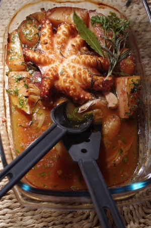 Hobotnicę, czyli ośmiornicę, należy oczyścić. Czyni się to bardzo prosto – trzeba wywinąć jej głowę jak rękawiczkę i wyjąć wnętrzności. Teraz należy usunąć oczy i wycisnąć twardy otwór gębowy znajdujący się u nasady macek. To wszystko. Teraz można ośmiornicę, jeśli spora, zbić tłuczkiem. Do naczynia dosyć głębokiego wlewamy ze dwie do trzech łyżek oliwy i tyleż oleju. Kładziemy na to ośmiornicę, kilka ziemniaków pokrojonych na połówki i cebulę pokrojoną na ćwiartki, dodajemy dwa ząbki czosnku w całości. Ziemniaki solimy, całość posypujemy sporą ilością świeżego rozmarynu, naczynie przykrywamy i stawiamy do rozgrzanego do 180 stopni piekarnika na około godzinę. Po tym czasie odkrywamy, dolewamy trochę białego wytrawnego wina, dodajemy jeden drobno posiekany ząbek czosnku i dalej pieczemy, ale już naczynia nie przykrywając. Gdy ośmiornica z wierzchu lekko się zrumieni jest gotowa do jedzenia. Wykładamy ją na półmisek, obok kładziemy ziemniaki i cebulę, całość polewamy sosem jaki zgromadził się w naczyniu.
