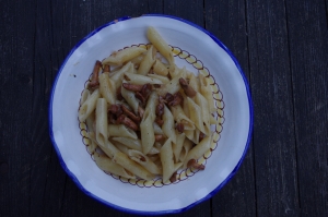 | Makaron z kurkami Makaron – najlepiej aby były to rurki, zwane z włoska penne rigate, gotujemy al dente w osolonej wodzie. Na patelni podduszamy na oliwie drobno posiekaną cebulę, po czym dodajemy oczyszczone kurki, ważne aby grzyby nie były mocno poszatkowane, lepiej aby zachowały swój naturalny kształt, zatem kroimy tylko wielkie egzemplarze, mniejsze podsmażamy w całości. Pod koniec smażenia dodajemy trochę roztartego z solą czosnku – jeden ząbek. Taki sos przyprawiamy pieprzem. Do sosu wrzucamy odsączony makaron i całość mieszamy, jeszcze przez chwilę trzymając na ogniu. Niektórzy do tak przygotowanego sosu dodają w celu zagęszczenia śmietanę, ale nie jest to konieczne, mało tego, zdecydowanie zmieniamy w ten sposób smak potrawy. |