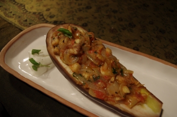 Dwa bakłażany przekroić wzdłuż na połówki, łyżeczką wydrążyć miąższ. Pokroić go drobno. Na głębokiej patelni rozgrzać kilka łyżek oliwy. Podsmażyć na oliwie trzy posiekane cebule, po chwili kilka zmiażdżonych ząbków czosnku, przyprawić solą i pieprzem. Gdy cebula zmięknie, dodać pokrojone w kostkę trzy lub cztery pomidory pozbawione skórki i miąższ z bakłażanów. Dorzucić łyżkę oregano i tyle samo natki pietruszki. Można też dodać tymianek. Całość dusić przez około 20 minut. Tak powstałym farszem napełnić połówki bakłażanów. Ułożyć je w żaroodpornym naczyniu, do którego należy nalać oliwę i wcisnąć sok z połowy cytryny. Uzupełnić wodą, tak aby płyn sięgał do połowy wysokości bakłażanów. Zapiekać w piekarniku rozgrzanym do 160 stopni przez około godzinę. Podawać można z gęstym jogurtem.