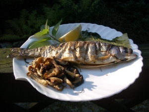 | Pstrągi Pouciekańca Pstrągi po sprawieniu należy natrzeć solą, po czym oprószyć odrobiną świeżo zmielonego białego pieprzu. Do ich wnętrza można włożyć ulubione zioła, może to być rozmaryn, koperek, oregano lub garść młodej pokrzywy. Teraz odstawić na jakiś czas, aby sól dotarła do wnętrza. Grzyby, shitake i boczniaki, pokroić na mniejsze kawałki, wyłożyć na rozgrzaną patelnię, odparować nadmiar wody, która się pojawi, posypać zmiażdżonym czosnkiem, podlać odrobiną oliwy. Gdy się smażą wyłożyć na ruszt pstrągi. Czekać do momentu, gdy ich skóra się zacznie się mocno rumienić, a ich mięso będzie soczyste, ale nie przesmażone. Podawać na talerzu z grzybami, tłuczonymi ziemniakami oraz np. szpinakiem z patelni. |