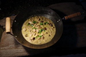 | Zielone curry z kurczaka Około pół kilograma udek kurczaka pozbawionych skóry i kości kroimy na kawałki o długości 2-3 centymetrów. Trawę cytrynową, dwie łodygi, po usunięciu twardych zewnętrznych części siekamy bardzo drobno. Dwie szalotki kroimy w cienkie plasterki, siekamy kilka ząbków czosnku i kawałek imbiru, skórkę limonki kroimy w paseczki. Jednego bakłażana kroimy w kostkę o wielkości około dwóch centymetrów. Rozgrzewamy wok, wrzucamy do rozgrzanego dwie do trzech łyżek zielonej pasty curry, smażymy mieszając. Po mniej więcej trzech minutach dodajemy pokrojonego kurczaka i mieszamy, aby wszystkie kawałki pastą się pokryły. Po chwili dodajemy trawę cytrynową, czosnek, imbir, szalotkę i skórkę z limonki oraz łyżkę sosu rybnego, odrobinę cukru, przyprawiamy solą i smażymy jeszcze przez minutę mieszając. Po tym czasie wkładamy pokrojonego bakłażana, mleko kokosowe z puszki, trochę wody, zmniejszamy ogień i dusimy do momentu aż kurczak będzie miękki. Curry podajemy posypane siekaną kolendrą i bazylią. |