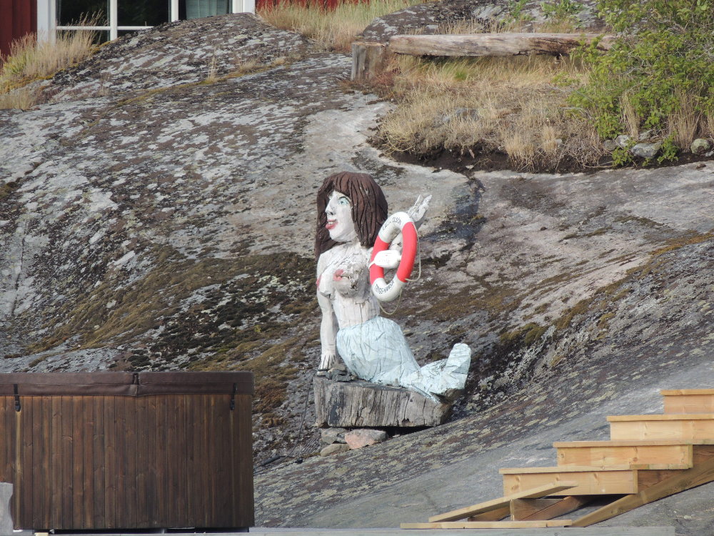 W poniedziałek, 28 lipca, od rana trochę pracy, trochę spacerów po skałkach, trochę kąpieli (woda 22...23°C) i wychodzimy o 1210 do następnej przystani, którą znaleźliśmy w naszych, nowych przewodnikach. Stugvik na wyspie Stora Alö (58° 06¢ 58¢¢ N, 16° 49¢ 03¢¢ E). Stajemy dziobem do pomostu z rufą na bojce. W zatoczce dużo jachtów stoi na kotwicach lub przy bojkach SXK. Jest to przystań klubowa z bardzo bogatym zapleczem. Tu odbywają się coroczne spotkania klubowiczów w święto Midsommar 22 czerwca. Są długie stoły biesiadne, ogromny grill, placyk do zabaw dla dzieci, jest nawet duży drewniany podest – pewnie przygotowany na tańce☺. (zdj.3) W nocy przyszła kilkugodzinna ulewa z bardzo silnym wiatrem NW. Dobrze, że wieczorem odsunęliśmy się dziobem od pomostu, bo ten wiatr tak napierał na jacht, że aż bojka rufowa zanurzała się całkowicie pod wodę. Rano, we wtorek, wiało jeszcze dość mocno z W, ale po południu wypływamy dalej na północ. Mijamy urocze zatoczki i wysepki (niektóre zamieszkałe)...czyli mówiąc po prostu zachwycające krajobrazy szkierowe, które tak lubimy. Syrenkę ze zdjęcia znają na pewno wszyscy, którzy choć raz płynęli tą trasą. Celem dzisiejszego etapu jest zatoczka na wyspie Håskö, z dużym kotwicowiskiem, przystanią jachtową oraz fajnymi miejscami przy skałach.Po drodze zajeżdżamy do Fyrudden (58° 11¢ 29¢¢ N, 16° 51¢ 05¢¢ E) aby uzupełnić zapasy wody i paliwa. Wieje fajnie z W i SW więc płyniemy na żaglach. W