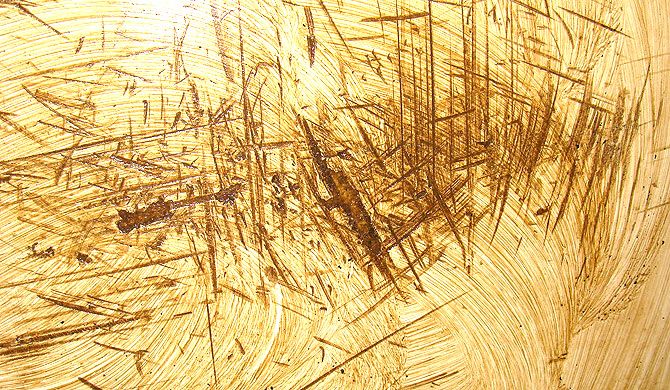Poniższe zdjęcia pokazują wybrany fragment powierzchni dna przed operacją i po. Widać wyraźnie smugi po ruchach gąbką. Tak, po odczekaniu minuty lub dwu, przecieramy miejsce gąbką, a efekt widać na zdjęciu po prawej. Te rysy to pokiereszowane dno, ale to inny problem. Zapewniam, że powierzchnia ta nie poddała się myjce ciśnieniowej, szczotkom lub papierowi ściernemu.