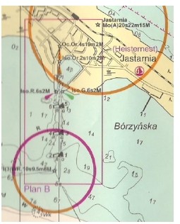 Podejście do Jastarni najlepiej rozpocząć od znaku bezpiecznej wody JAS Lfl.10.s od którego kierując się KR 000,4° dopłyniemy do pogłębionego toru wodnego wprowadzającego do portu. Jego początek wskazuje nam stawa zwana popularnie Kaszycą Fl(3)WR.10s. Pamiętajmy, że kierując się do Jastarni Kaszyce należy minąć LEWĄ burtą pozostając w jej sektorze białym. Po przeciwnej stronie na głębokości ok 1,4 m znajdują się bowiem kamienne rumowiska, o które niechybnie można zahaczyć kilem. Od wspomnianej kaszycy płyniemy wyznaczonym torem wprost w główki portu Iso. R. 6s i Iso.G.6s. Tor ten o szerokości ok.30 m i długości ok 300 m wyznaczają znaki prawej i lewej strony o charakterystyce Fl(2). Pamiętajmy, ze wypłynięcie poza znaki niechybnie kończy się wejściem na mieliznę. Głębokości poza torem wahają się bowiem od 0,8 m do 1,5 m. Szczególną ostrożność należy również zachować przy lewej główce portu ze względu na tworzące się tutaj okresowe wypłycenia. Niezmiernie pomocne przy wpływaniu (ale i wypływaniu) z Jastarni są nabieżniki. Górny pomarańczowy o charakterystyce Oc. 4s i dolny również koloru pomarańczowego Iso. 2s. Znajdują się one kolejno na wysokości 19 i 10 m. Zasięg nominalny świateł nabieżników to jedynie 2 mile jednak jest to odległość wystarczająca by odpowiednio wcześnie ustawić jacht w taki sposób aby uniknąć przykrych niespodzianek. Wszystkim zmierzającym do Jastarni przypominamy także o konieczności dokonania zgłoszenia i uzyskania zgody na wejście od Bosmana Jastarni. Ze względu na duży ruch jednostek w tym rejonie i specyfikę akwenu zgłoszenie takie jest bezwzględnie wymagane VHF kanał 10.