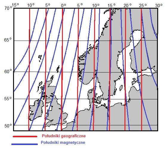 Tyle z grubsza o kursie rzeczywistym. I gdyby kompas pokazywał północ rzeczywistą – tak jak wskazują ją południki - wszystko byłoby proste. Igła kompasu jednak nie układa się zgodnie z przebiegiem południków geograficznych, tylko magnetycznych (a i to nie do końca, o czym przekonamy się za chwilę). Tak więc zadaniem nawigatora jest skorygowanie wskazań kompasu tak, aby na ich podstawie dowiedzieć się, gdzie rzeczywiście znajduje się północ geograficzna (rzeczywista). Aby tego dokonać należy znać wartości różnicy kątowej pomiędzy przebiegiem południków magnetycznych i geograficznych w danym miejscu i czasie – gdyż układ południków magnetycznych zmienia się na skutek „wędrówki” biegunów magnetycznych, o czym pisaliśmy w poprzednim rozdziale. Różnica kątowa pomiędzy północą geograficzną a magnetyczną (a dokładniej przebiegiem południków magnetycznych i geograficznych) to deklinacja.