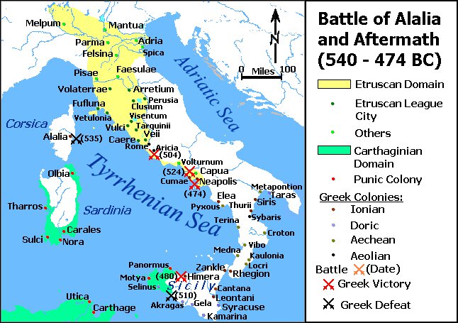 Grecka kolonizacja brzegów południowej Italii oraz Sardynii i Korsyki była dla Etrusków i Kartagińczyków przeszkodą w swobodnej ekspansji na morzu. Sytuacja ta stała się główną przyczyną działań wojennych w roku 535 p.n.e.![]() |