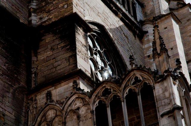 Traf chciał, że zacumowaliśmy obok barki, na której grupa starszych Francuzów popijała w najlepsze pyszne francuskie wino. To tylko zaostrzyło nam apetyty. Po „podłączeniu się” do prądu i wody (trzeba uzupełnić zapasy) szybko pobiegliśmy do sklepu (również aby uzupełnić zapasy). Auxonne, mimo że mniejsze niż Dole, było równie klimatyczne. Od strony wody otoczone grubymi murami miejskimi z wieżyczkami, sprawiało wrażenie, jakby zatrzymał się w nim czas. W centrum odkryliśmy pozostałości bramy albo łuku triumfalnego, ruiny zamku i sporo ślicznych domków. Tu także nad dachami górowała wieża pięknego gotyckiego kościoła – bardzo wysoka i spiczasta. Okazało się też, że w tym właśnie miasteczku znajduje się szkoła artylerii, w której swe pierwsze kroki jako żołnierz stawiał sam Napoleon.