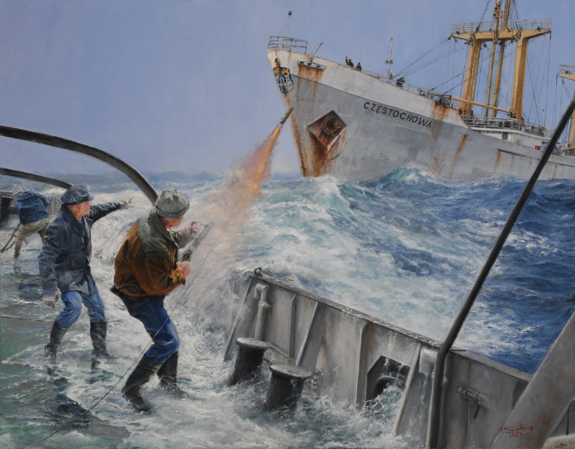 Zaliczyłem stosunkowo sporo publikowanych publicznie lektur na temat malarstwa marynistycznego i okazjonalnych prezentacji prac związanych z Polskim Ratownictwem Okrętowym. Kilkakrotnie padało tam pytanie “co robimy jak zerwie się lina holownicza”. Dało mi to impuls do namalowania (w roku 2023) obrazu pod tytułem “Następne podejście”. To obraz, który nawiązywał do historii ratowania “Częstochowy”, która już została opublikowana w SSI roku 2018.