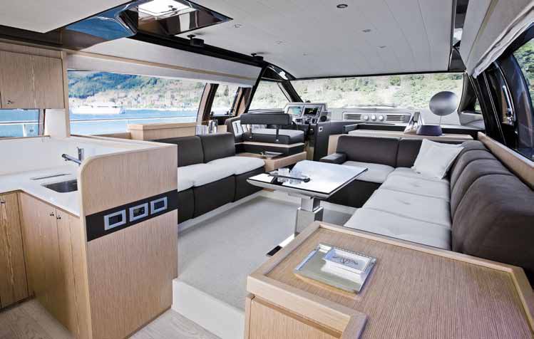 sobie niewielką jadalnię na zewnątrz. Zachęca do tego uchylana do góry szklana ściana salonu, łącząca wnętrze salonu i kambuz z kokpitem, co znacznie zwiększa wrażenie przestronności obu powierzchni.