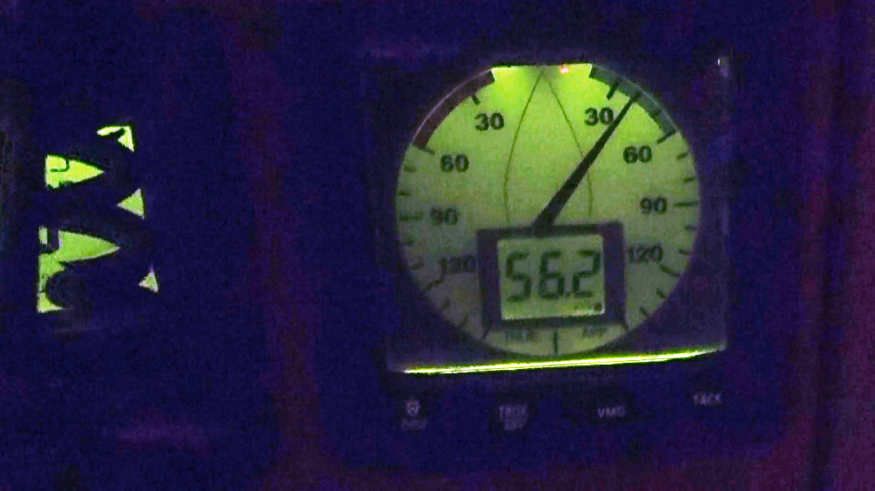 Wybrana taktyka ciężkiej walki z żywiołem sprawdziła się w stu procentach. Nasz jacht parł niczym taran do przodu, mimo coraz większych fal. Około godziny 1800 wiatromierz coraz częściej zatrzymywał się powyżej 40 węzłów, a prędkość zaczęła przekraczać 8 węzłów. W sztormie to zdecydowanie za dużo na jacht ważący prawie 60 ton. Tak rozpędzona Katharsis II potrafi spaść z fali w otchłań, uderzając w wodę niczym o beton. Zrzucenie sztaksla zmniejszyło prędkość do bezpiecznych 4-5 węzłów. Z nastaniem ciemności wiatr wzmógł się do ponad 55 węzłów. Towarzyszył mu zacinający śnieg, który zredukował widoczność do zera. W takich warunkach spada skuteczność pomocniczej kamery termowizyjnej. Przedłużeniem naszych oczu pozostaje tylko radar, który pokazał na naszym kursie górę lodową. Natychmiast zredukowaliśmy prędkość jachtu idąc jeszcze ostrzej do linii wiatru. Po raz kolejny udało się ominąć lodowe niebezpieczeństwo. W tym miejscu i w tych warunkach takie spotkanie było na prawdę niebezpieczne. To były bardzo ciężkie godziny dla wszystkich, zarówno dla wachty zmagającej się z zawieją i wichurą na pokładzie, jak i dla reszty załogi czuwającej pod pokładem.