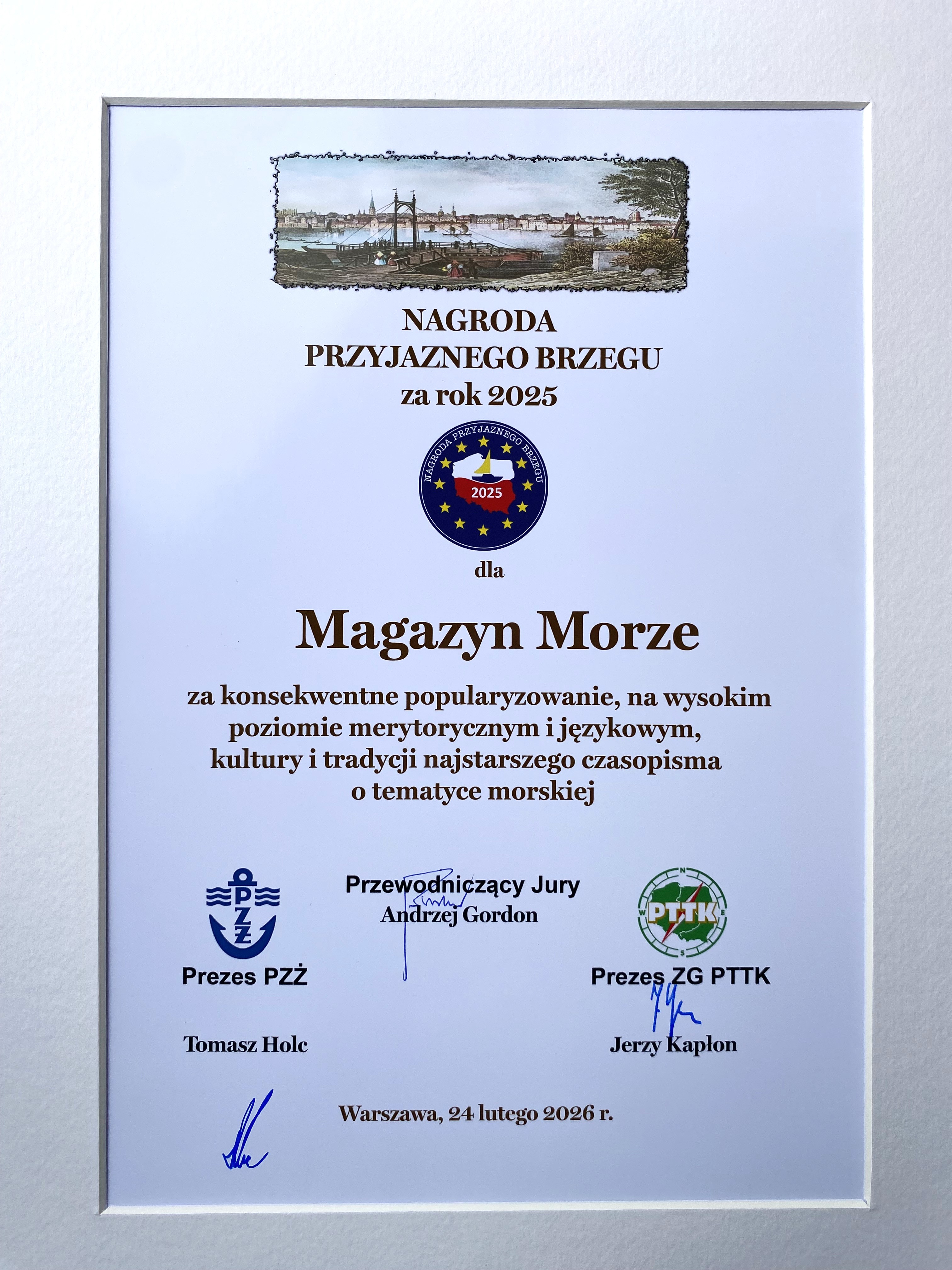 Jednym z laureatów najnowszej edycji konkursu, obejmującej działalność w 2025 roku, został magazyn Morze. Podczas uroczystej gali redaktor naczelny Marcin Buś odebrał nagrodę z rąk Przewodniczącego Jury, Andrzeja Gordona.