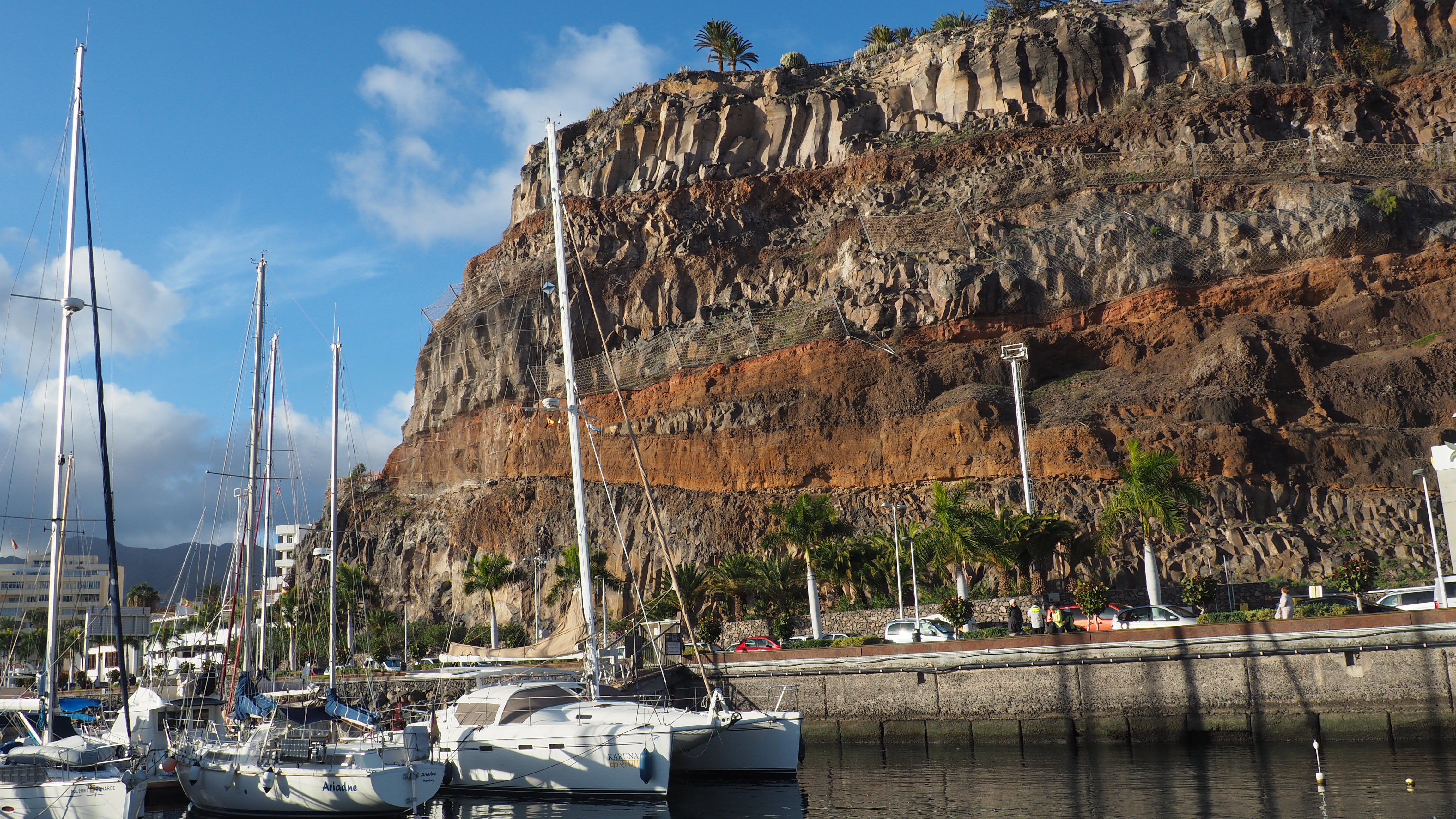 My chcemy płynąć na Gigantes, druga łódka pozostaje w marinie. Zabieramy stamtąd Mundka i w drogę. Wieje w mordę. W drodze powrotnej kierunek ma być ten sam, ale wiać ma nieco więcej. Po lewej burcie Gomera, po prawej ładne południowe wybrzeże Teneryfy, dosyć mocno usiane miejscowościami i sporymi hotelami. Od ostatniej mariny Los Gigantes koniec cywilizacji, zaczynają się piękne skały. Płynęliśmy żeby je zobaczyć. Mają po 600 metrów wysokości, zajmują nadbrzeżny, południowo-zachodni odcinek wyspy na dystansie 10 km. Skały o różnej strukturze i barwie są też siedliskiem dla licznego ptactwa. Mniej więcej w ich połowie widać kanion którym na piechotę można dotrzeć z Masci do morza. Nieco dalej stajemy w dryfie, kilka osób kąpie się w morzu. Potem stawiamy szmaty i pięknym baksztagiem wracamy do mariny. W końcu mamy super warunki żeglarskie. Wieje 16 – 18 kn, my w porywach robimy po 9 węzłów. Szampański nastrój dodatkowo podkreśla fajna muzyka. Tak można żyć. Nawet osoby które miały kłopoty gastryczne w poprzednich przelotach czują się bardzo dobrze. Pod wieczór dopływamy do mariny. Tankujemy diesel, jutro będziemy się obijać w miasteczku. Arek z sąsiedniej załogi wynajął rower, wskoczył na nim na chwilę na El Tide i wrócił z powrotem. Niezły wyczyn, trzeba przyznać. Jemy bardzo obfitą kolację, potem wypad na lody. Wieczór w kokpicie.