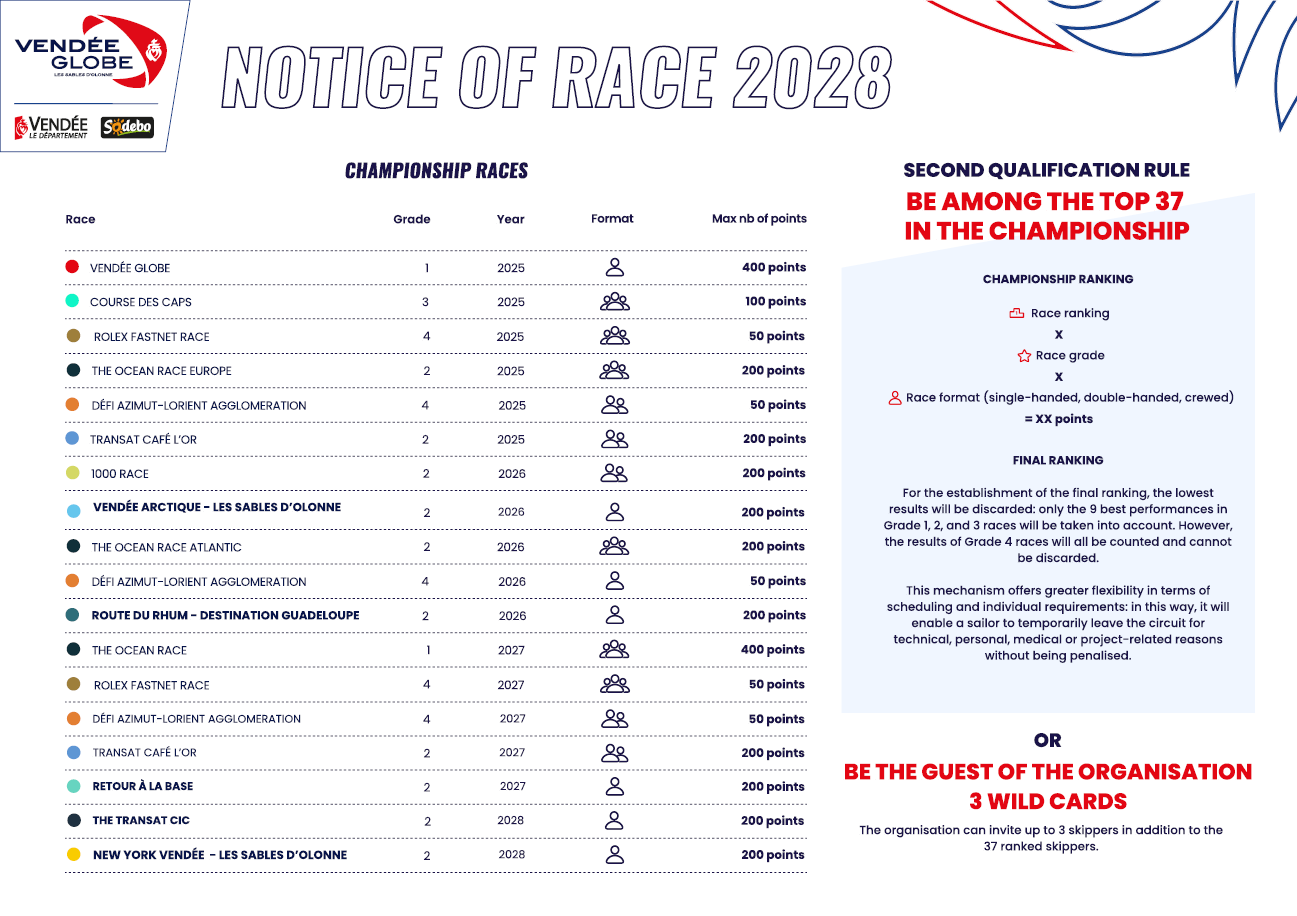 Po spełnieniu tego warunku sternicy muszą znaleźć się w gronie 37 najlepszych w mistrzostwach IMOCA Globe Series, które opierają się na kilku kryteriach. W każdym wyścigu sternicy zdobywają punkty w zależności od rankingu, klasy wyścigu i jego formatu (solo, w parze lub z załogą). Aby ustalić klasyfikację końcową, odrzucane są najgorsze wyniki każdego zawodnika: brane pod uwagę będzie tylko dziewięć najlepszych wyników w wyścigach klasy 1, 2 lub 3. Wyniki wyścigów klasy 4 będą brane pod uwagę i nie można ich odrzucać.