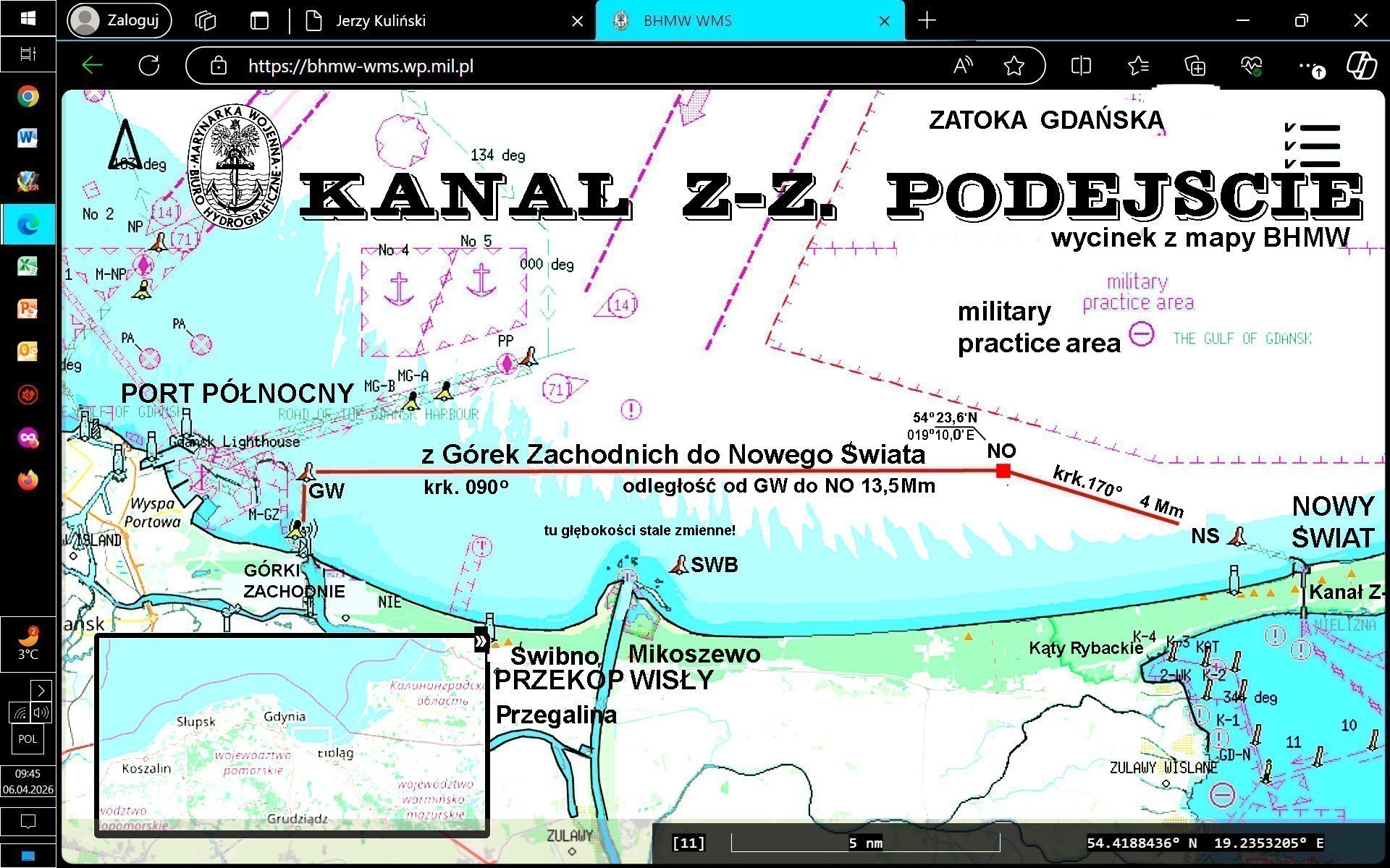 Sytuacja się zmienia w miarę przybliżania się do wirtualnego punktu „NO”. Po lewej burcie pojawia się obszar wojenno-morskich ćwiczeń Marynarki i Straży Granicznej. W tym rejonie bezpieczniejszy będzie lewy hals.