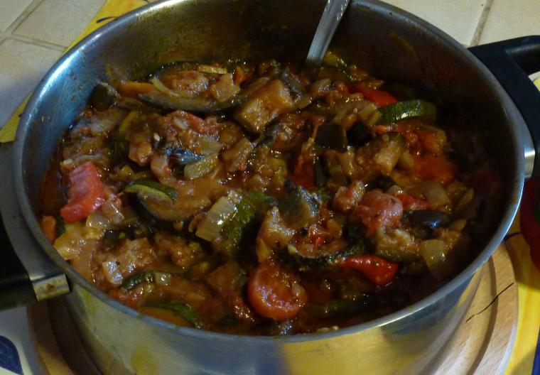 Na patelni rozgrzać oliwę i smażyć na niej po kolei przygotowane warzywa - cukinię, bakłażany i paprykę (jeśli papryka była opiekana w piekarniku w celu zdjęcia skórki, to jest już na tyle miękka, że nie trzeba jej jeszcze obsmażać). Usmażone przekładać do garnka z pomidorami i cebulą. Gdy już wszystkie warzywa znajdą się w garnku, z powrotem postawić go na wolnym ogniu, doprawić warzywa do smaku solą, pieprzem i cukrem, dodać przecier pomidorowy i dusić pod przykryciem ok. 15 minut mieszając od czasu do czasu.