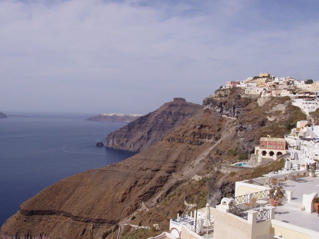 Dwie najważniejsze miejscowości na wyspie to Thira (stolica) i Oia (czyt.: „Ia”). Obie stanowią piękne zwieńczenie santorińskiego klifu i to ich podświetlony latarniami, piękny widok o świcie, opisywałem wcześniej. O atrakcjach Thiry poczytajmy w przewodnikach, tyle tego jest do zwiedzania. Na szczyt możemy się dostać kolejką linową lub na osiołku po 580 stopniach, albo własnych nogach.