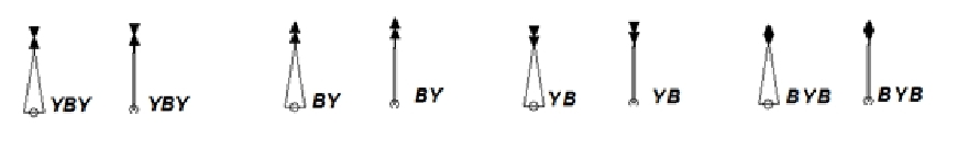 Oznaczenie znaków kardynalnych na mapie zależne jest od rodzaju znaku. Podane też są litery sugerujące kolor znaku BY – black, yellow (czarno-żółty), YB – yellow, black (żółto-czarny), BYB black, yellow, black (czarno-żółto-czarny), YBY – yellow, black, yellow (żółto-czarno-żółty). Uwidoczniony jest także rodzaj znaku szczytowego. Znaki te mogą być umiejscowione na kolumnach lub tykach. Pamiętajmy. O rodzaju i znaczeniu znaku decyduje znak szczytowy i barwa a nie kształt samego znaku, który widzimy na wodzie.