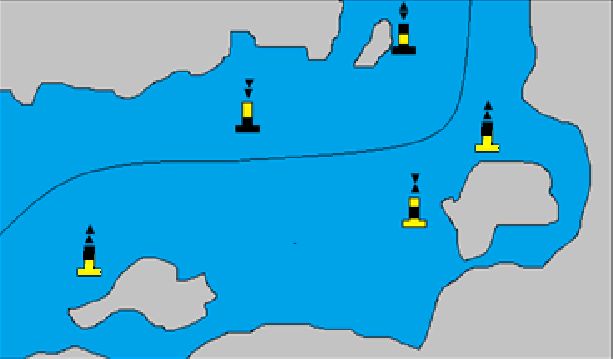 Jeżeli znaki nawigacyjne „uzbrojone” są w światła, dzięki którym możemy je zidentyfikować w nocy, przy znaku na mapie znajdziemy „łezkę” koloru fioletowego oraz opis charakterystyki światła Pamiętajmy, że kierunek skierowania „łezki” na mapie nie sugeruje nam, w którą stronę światło znaku jest skierowane, ale informuje jedynie, że znak taki w ogóle takie światło posiada.