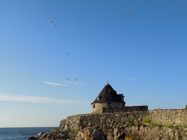 Ruszyliśmy wzdłuż muru obronnego podziwiając domki oficerskie, dawne magazyny i koszary. Z tego co udało nam się dowiedzieć podczas naszej poprzedniej wizyty na wyspie, w dalszym ciągu należy ona do wojska a tutejsze budynki są tylko dzierżawione ludności cywilnej z zastrzeżeniem nie zmieniania ich wystroju zewnętrznego. Wyspa dzięki temu zyskała specyficzny charakter. Po godzinie 18, gdy odpłynie stąd ostatni prom ze stonką, wyspa przenosi się w czasie do XVII wieku ponieważ cała zabudowa praktycznie jest z tego okresu lub została zrekonstruowana. Miejsce to byłoby rajem dla fanów gier terenowych typu LARP.