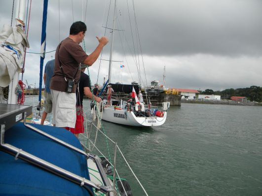 W Balboa (nazwa miasta na cześć hiszpańskiego konkwistadora Vasco Nunez de Balboa, który 25 września 1513 roku pierwszy zobaczył Pacyfik) stoimy na kotwicy do środy czekając na decyzję Panama Canal Authority. W środę rano wraz z polonijnym jachtem NIUNIA z Yachklubu Polski z San Francisco przy boi nr 4 oczekujemy na pilotów. Ich przypłynięcie opóźnia się prawie o pół godziny. Wreszcie o godzinie 06.30 zjawiają się na burcie. Ruszamy. Każdy jacht posiada na pokładzie cztery cumy o długości 150 stóp każda i 4 odbijacze zrobione z opon owiniętych taśmą, pożyczone z Balboa Yacht klub (oczywiście nie za darmo). Do pierwszej śluzy Miraflores wchodzimy tuż za wielkim masowcem RIO BUENO pod banderą Liberii. Cumujemy o godzinie 10.30 (czas chicagowski) lewą burtą do holownika, do naszej prawej cumuje NIUNIA. Tutaj dopada nas pierwszy poważniejszy kłopot. Wielki masowiec ruszając do kolejnej śluzy uruchamia równie wielką śrubę i kieruje na nas bardzo gwałtowny prąd wody. Odcumowana już NIUNIA manewruje tuż obok naszej prawej burty. W tym momencie komenda z holownika zwalnia naszą dziobową cumę i szpring z lewej burty. HUSARIA pod wpływem prądu od RIO BUENO ustawia się w poprzek śluzy, opierając się rufą na burcie holownika i celując dziobem w burtę NIUNII. Interwencja sternika HUSARII zapobiega kolizji. Obydwa jachty dotykają się burtami bez dalszych konsekwencji. Niemniej jest to poważne ostrzeżenie przed słuchaniem fałszywych komend.